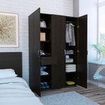 Armario con amplios espacios para colgar ropa. Dos tubos cromados y cerradura metálica. Incluye manual de armado. Hecho de madera aglomerada, limpiar