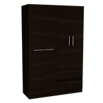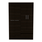 Closet con cuatro puertas y dos cajones, con amplios espacios para almacenar ropa y un tubo cromado para colgar ropa. . Hecho de madera aglomerada, li