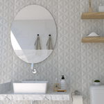 Espejo sencillo ovalado, con diseño en sanblasting en la parte inferior, ensamble a la pared con chaflan
