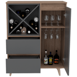 Amplia mesa de bar hecha en madera aglomerada de 15mm. Cuenta con un colgador de copas, rack para botellas de vino y dos cajones con riel extensión. M